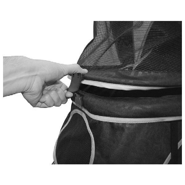 Wózek posiada duże przednie okno z zapinaną siatką w szczególny sposób, za pomocą systemu NON ZIPP Clip, zapewniającego bezpieczeństwo, optymalną wentylację i wspaniały widok. Wnętrze oferuje wygodne,