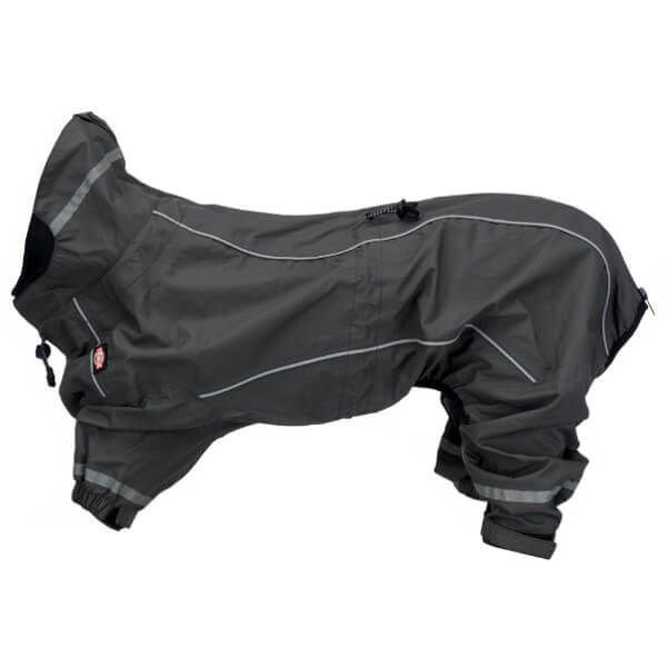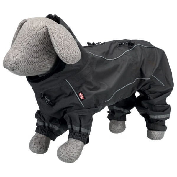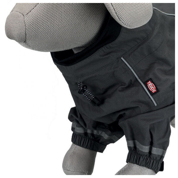 Trixie kombinezon Vaasal przeciwdeszczowy dla psa, chroni całe ciało przed wilgocią i brudem podczas jesiennych czy zimowych spacerów. Ubranko jest szczególnie polecane dla psów ras długowłosych. Kombinezon jest wodoodporny i chroni przed wiatrem, posiada membranę przepuszczającą powietrze. Szwy w ubranku są klejone i zamek błyskawiczny zapinany a grzbiecie jest wodoszczelny. Kombinezon Vaasal ma naszyte elementy odblaskowe, które podnoszą poziom bezpieczeństwa na wieczornym spacerze. Idealne dopasowanie zapewniają elastyczne wstawki, ściągacz na sznurek i zapięcie na rzepy. Ubranko wykonano z poliestru, który można prać w pralce w temperaturze 30 stopni.