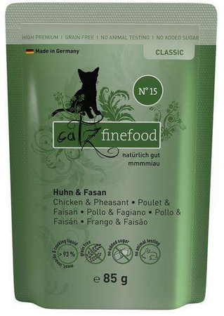 Specjał dla kotów – wartościowa karma dla naszych pupili. Catz finefood N°15 zawiera dużo delikatnego kurczaka, bażanta oraz wartościowe dodatki, jak rzeżucha i mniszek lekarski. Bez konserwantów, barwników i wzmacniaczy smaku. Nie zawiera GMO. Mmmmiau!