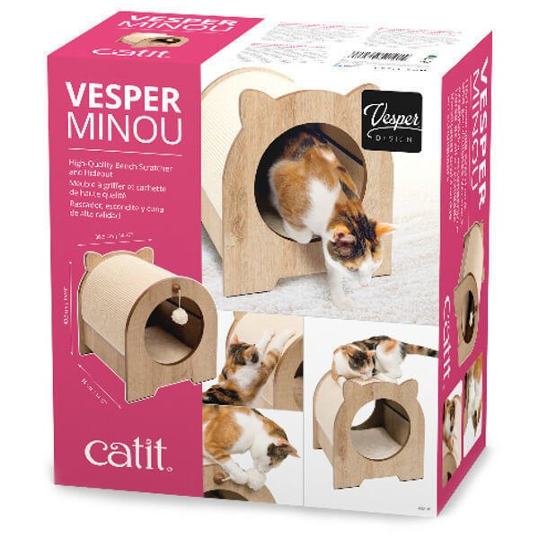 Hagen Catit Vesper Minou to przytulna kryjówka z dwoma wejściami, Twój kot właśnie znalazł swoje ulubione miejsce. Idealne miejsce dla pazurów domowego tygrysa, które ochroni meble przed uszkodzeniem. Legowisko wykonano z wysokiej jakości płyty MDF z powłoką laminowaną w kolorze dębu. Minou to stylowe 2 w1, drapak do scratchowania pazurów i kryjówka w jednym. Twój kot z przyjemnością weźmie długie, relaksujące drzemki wewnątrz i wyostrzy pazury na zaokrąglonych zewnętrznych powierzchniach sizalu. Legowisko jest wyściełane ciepłą poduszką z efektem memo-foam. Pianka memo, wewnątrz miękkich poduszek idealnie dopasowuje się do kształtu ciała Twojego kota i oferuje dodatkową wygodą. Zarówno wymienna mata i poduszka, jak i wysokiej jakości wykonanie sprawiają, że Vesper Minou to stylowy i praktyczny mebel dla kotów pasujący do każdego wnętrza.