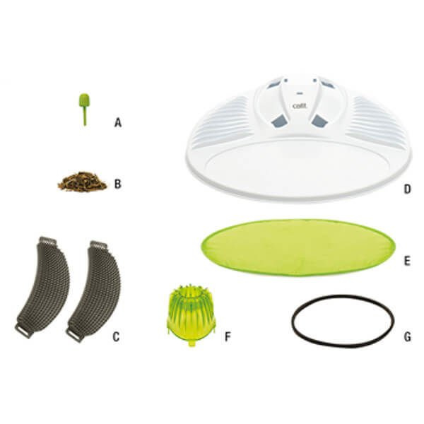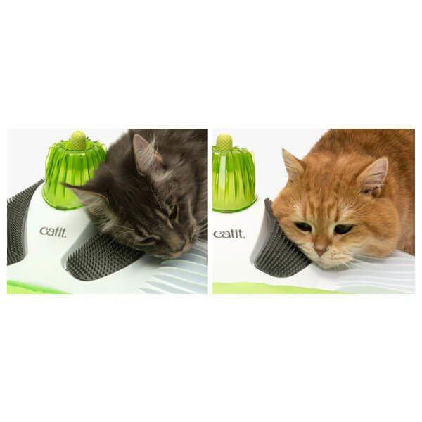 Dzięki badaniom rynku i cennym opiniom klientów Hagen Catit wyposażył Centrum Masażu w sprytne, nowe elementy. Centrum Wellness Catit Senses to miejsce, w którym twój Kot może się zrelaksować. Oferuje różnorodne kształty pędzli, tekstury powierzchni i grzebienie do masażu, które umożliwią kotom oczyszczenie, masaż i rozpieszczanie. Elementy masażera są łatwo dostępne, aby dopasować je do indywidualnych preferencji i nawyków każdego kota. Wygodne, zielone legowisko możesz dla uatrakcyjnienia popryskać kocimiętką. Bezpiecznie zostało zamocowane w centrum odnowy biologicznej za pomocą kilku pasków z rzepami. Centrum Wellness Senses ma płaską, ergonomiczną podstawę z falistymi grzbietami masującymi z każdej strony. Pozwalają one Twojemu kotu naciskać i masować, drapać nawet w trudno dostępnych a zarazem ulubionych przez niego miejscach. Pielęgnacja to jedna z ulubionych rozrywek kocich, dlatego masażer oferuje dwa mocne, ale elastyczne szczotki do usuwania i wchłaniania luźnych włosów. Na szczycie urządzenia znajduje się wszechstronna głowica do masażu, idealna do głowy i szyi Twojego pupila, pomagająca rozładować stres i znaleźć relaks. Głowica do masażu dziąseł działa jak szczoteczka do zębów. Podczas gdy kot skubie teksturowane pokrętło, jednocześnie myje swoje zęby i dziąsła. Dobra higiena jamy ustnej jest ważna, aby zapobiec nieświeżemu oddechowi i chorobie. Dlatego zachęcaj swojego kota do skubania przez zraszanie kocimiętką nad głowicą do masażu dziąseł. Centrum odnowy biologicznej Senses można z łatwością demontować i czyścić. Podkładkę można czyścić wilgotną szmatką, natomiast elementy plastikowe można myć ręcznie. Najlepiej używać naturalnego, nie zawierającego chemikaliów mydła i dokładnie wypłukać części po czyszczeniu.
