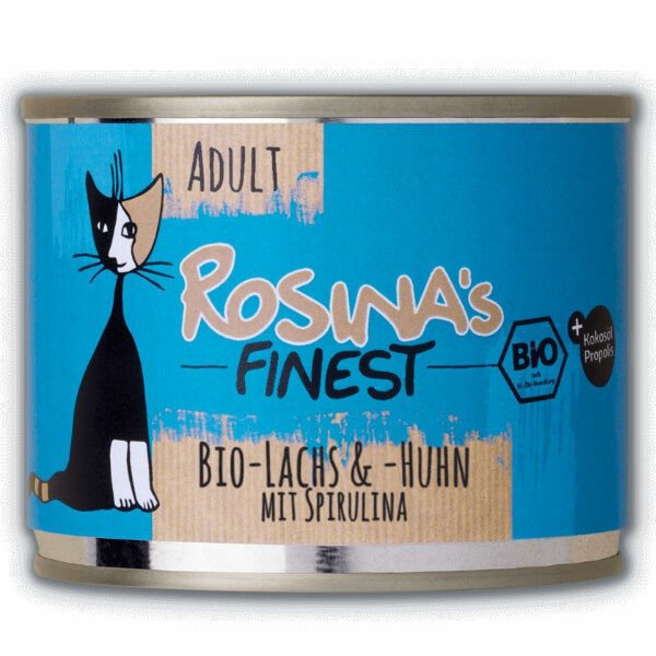 Rosina''s Finest Bio to linia dla dorosłych kotów, która zawiera w swoim składzie od 93-95% mięsa. Warto zwrócić uwagę na to, że zawiera w swoim składzie tylko wartościowe kawałki określonych części danego mięsa. Receptura jest w 100% naturalna i ekologiczna. Już teraz możesz zaoferować swojemu kotu porządny posiłek najwyższej jakości. Nie mogło zabraknąć również czegoś z rybą! Ten wariant zawiera kurczaka wymieszanego z łososiem, pyszności. Posiada dodatek spiruliny, który będzie idealny dla kotów, które potrzebują wzmocnić swój układ odpornościowy. Wszystkie składniki odżywcze zostały dokładnie i odpowiednio dobrane.