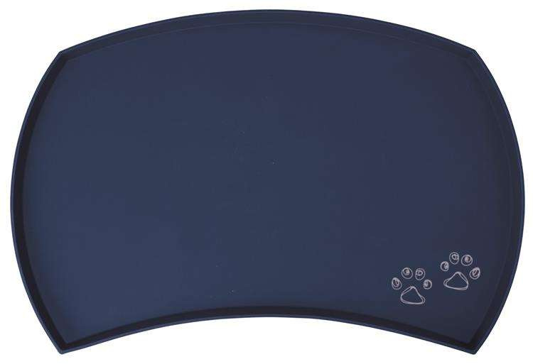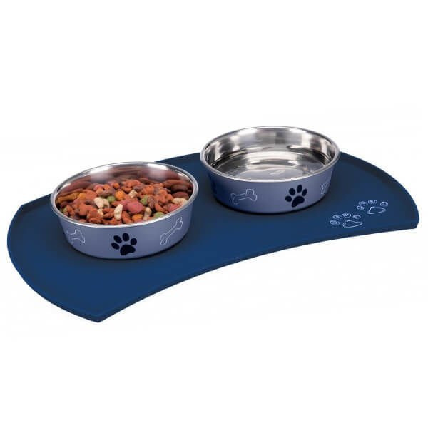 Podkładka antypoślizgowa Trixie z silikonu w kolorze niebieskim pod dwie miski dla Twojego psa lub kota. Posiada podwyższone brzegi, co zmniejsza możliwość rozlania wody, czy rozsypania karmy podczas posiłku pupila. Idealnie pasuje do misek o średnicy 22 cm. Zapobiega przesuwaniu się misek podczas jedzenia i pomaga w utrzymaniu czystości wokoło nich. Dekoracyjny motyw śladów dwóch łapek dodaje oryginalnego charakteru podkładce.