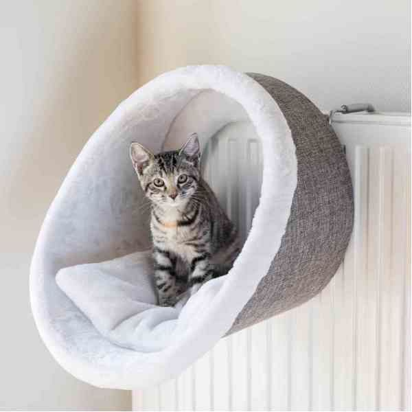 Trixie legowisko na kaloryfer dla kota, z wyściółką z miękkiego pluszu. Idealne jako miejsce do odpoczynku i obserwacji otoczenia. Posiada wytrzymałą, stalową konstrukcję oraz regulowane uchwyty 9-11cm, pasujące do wszystkich standardowych kaloryferów. Wyjmowana poduszka, którą można prać ręcznie w temperaturze około 30 stopni, ułatwia utrzymywanie legowiska w czystości.
