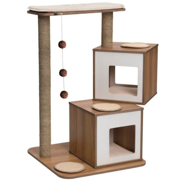 Catit wprowadziło nową linię eleganckich mebli dla kotów "Vesper Design", która zaspokoi wszystkie potrzeby kotów oraz ich właścicieli. Drapak Double posiada dwie budki o kształcie sześcianu z dwoma wejściami. Może być używany przez wiele kotów. Średniej wielkości drapak wyposażony jest w wytrzymałe maty z sizalu, poduszki, naturalne słupki do drapania oraz trzy piłki ratanowe na sznurku. Wykonany został z najwyższej jakości płyt MDF z włókien drzewnych, co gwarantuje nam długą żywotność drapaka i odporność na wszelakie zarysowania. Natomiast słupek wytworzony został z naturalnej trawy morskiej - najlepszy materiał do drapania przez koty. Drapak bardzo łatwo utrzymać w czystości poprzez zastosowanie wyjmowanych poduszek z pianką Memory Foam, które bezproblemowo można wyprać ręcznie. Poduszki idealnie dopasowuje się do ciała kota, dzięki zastosowaniu odpowiedniej i komfortowej pianki. Od teraz Twój kot może zyskać ekstremalnie wygodny drapak Catit przy którym będzie mógł porządnie rozciągnąć swój grzbiet, pobawić się oraz zasnąć spokojnie na długie godziny. Sprawdź całą ofertę stylowych mebli "Vesper Design" dla kotów od Hagen w Megazoologiczny.pl.
