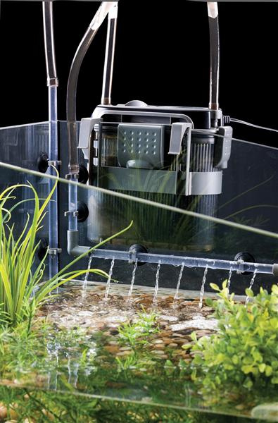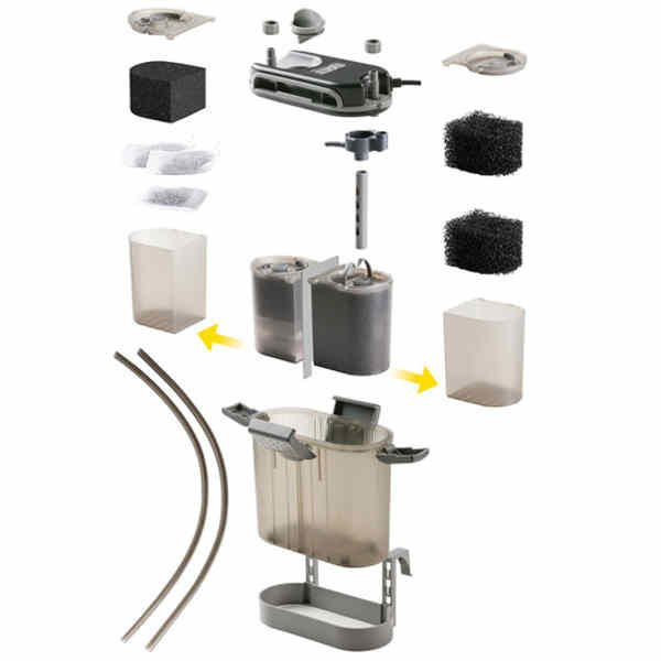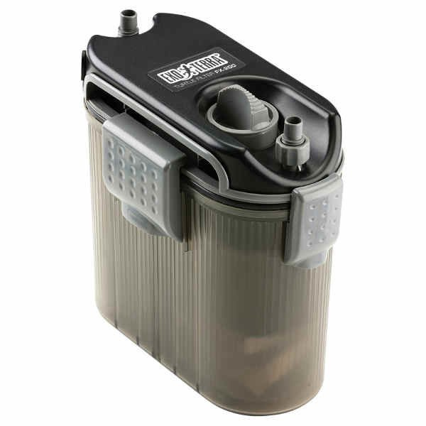 Exo Terra FX-200 zapewnia efektywny system filtrowania, skutecznie redukujący nieprzyjemne zapachy w zbiornikach z żółwiem, w paludariach oraz w terrariach wodnych. Konstrukcja dwukomorowa pozwala na największą elastyczność w serwisowaniu mechanicznych, chemicznych i adsorpcyjnych mediów filtracyjnych. Natężenie przepływu zostało precyzyjnie obliczone, aby zapewnić dokładną równowagę między filtracją mechaniczną, cyrkulacją wody i napowietrzeniem, co zapewnia optymalne warunki dla zółwi wodno-lądowych. W komplecie z systemem listew natryskowych dla lepszego napowietrzania i wszystkich niezbędnych mediów filtracyjnych. Dodatkowym atutem filtra jest zmniejszona częstotliwość konserwacji: co 1-2 miesiące dla zbiorników z żółwiem oraz co 2-4 miesiące dla innych siedlisk wodnych. Zestaw obejmuje następujące media filtracyjne: 1 drobna pianka, 2 grube pianki, 1 podkładka redukująca nieprzyjemne zapachy i podwójne podkładki węglowe. Podkładka redukująca nieprzyjemny zapach w połączeniu z podwójnymi wkładkami węglowymi zapewnia maksymalną zdolność pochłaniania amoniaku, korzystną w zbiornikach z żółwiem, paludariach lub terrariach wodnych o wysokim obciążeniu biologicznym.