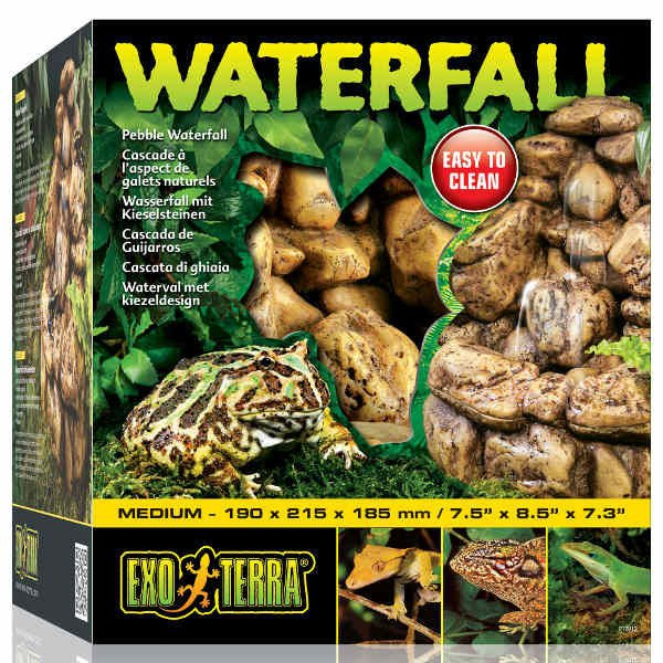 Kamienista konstrukcja wodospadu Exo-Terra zapewnia naturalny wygląd niewielkiego, kaskadowego strumienia w Twoim terrarium. Małe wodospady i strumienie są ważną cechą każdego tropikalnego środowiska. Kaskada wody stymuluje naturalne zachowania związane z piciem jaszczurek (jak: kameleony, anolisy, wodne smoki, itp.) Czyszczenie jest łatwe, ponieważ wodospad można rozłożyć na kilka elementów. Dołączona jest pompa Exo-Terra Repti Flo zapewniająca cyrkulację wody. Jako środek bezpieczeństwa, dla mniejszych kameleonów i żab, do zbiornika zbiorczego można dodać małe kamienie lub żwir. Odpady organiczne powinny być usuwane ze zbiornika zbiorczego w regularnych odstępach czasu w celu utrzymania czystości wody.