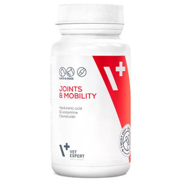 Preparat VetExpert Joints & Mobility dla psów i kotów wspomagający regenerację chrząstki stawowej i kości. Zalecany zarówno podczas rekonwalescencji, rehabilitacji psa, kota. Można go podawać w ramach profilaktyki przy psach narażonych na kontuzje, psy sportowe: typu border collie, husky ( psy zaprzęgowe) a także szepnięta ras dużych. Szczenięta dużych ras do 2 roku życia bardzo szybko się rozwijają i rosną. W przeciągu kilku miesięcy zwielokrotniają swoją masę nie rzadko 10 – krotnie. Dlatego w tym intensywnym okresie dobrze jest podawać im preparaty wspomagające. VetExpert stworzył mieszankę substancji chroniących stawy i poprawiających wzrost kości. To chondroityna, glukozamina – niezbędne w diecie każdego psa sadniki wzmacniające stawy i kości. Mają również działanie przeciwzapalne, zwiększają ilość produkowanej mazi stawowej. Najlepszym źródłem chondroityny jest jej siarczan. Ponieważ jest lepiej przyswajalny przez zwierzęta, a co ważne lepiej wchłaniany i skuteczniejszy. W skład preparatu wchodzi również kwas hialuronowy, który wzmacnia kości i jest niezbędny przy wszelkiego rodzaju urazach, rekonwalescencjach. Pozwala on odbudować szpik. Witamina C zawarta w preparacie na stawy i kości VetExpert pełni rolę nie tylko przeciwutleniacza, który wzmacnia odporność psa i kota. Przede wszystkim jej połączenie z chondro terapeutykami pozwala na lepsze wchłanianie witaminy D, odpowiedzialnej za odbudowę kości. Zaletą suplementu diety zakupionego w Megazoologiczny.pl dla psów i kotów VetExpert jest ich sposób podania. Wszystkie preparaty są podane w formie kapsułek Twist Off. Wystarczy je odkręcić i główkę smakowitej kapsułki wycisnąć do miski z karmą. To bardzo wygodny sposób serwowania leków, zwłaszcza przy kotach!