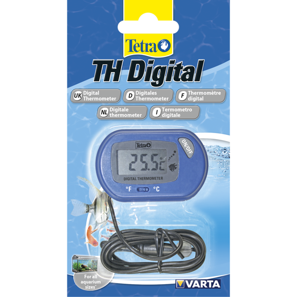 Tetra TH Digital to termometr zaprojektowany do dokładnych pomiarów temperatury wody w akwarium. Posiada czytelny, cyfrowy wyświetlacz umieszczony w niebieskiej obudowie. Nadaje się do zbiorników wszystkich rozmiarów i posiada w zestawie baterię Varta.