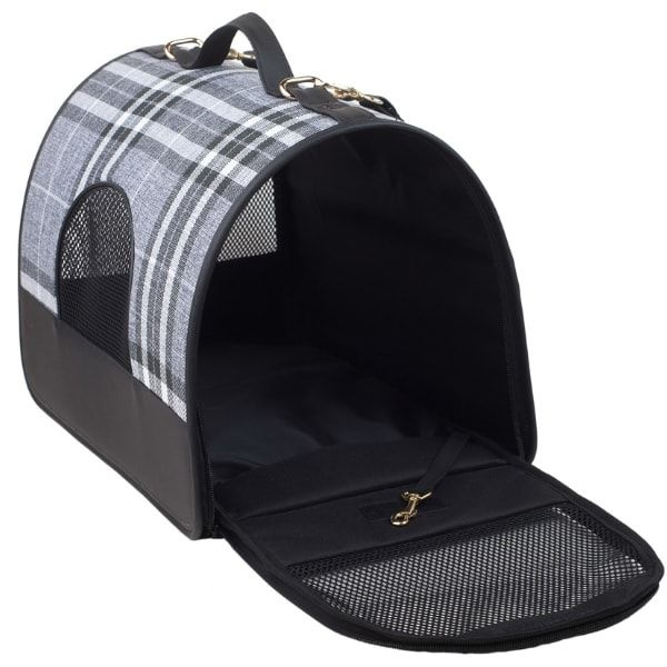 Transporter dla psa został wykonany z tkaniny poliestrowej w kratę oraz skóry ekologicznej w kolorze czarnym. Wypełnienie tej torby jest antyalergiczne. Posiada na spodzie nóżki stabilizujące oraz usztywniane dno.