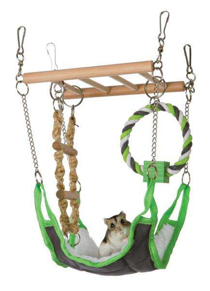 Trixie drewniany, podwieszany most z hamakiem to świetny dodatek do wystroju klatki mniejszego gryzonia, np. myszy lub chomika. Zapewnia aktywność fizyczną, jak i idealne do wypoczynku. Drabinki i obręcz sznurkowa z drewnianym klockiem doskonale umilają czas zwierzakowi i zapewniają mu mnóstwo zdrowej aktywności. Hamak wykonany z wytrzymałego nylonu, wyścielonego miękkim poliestrem jest bardzo wygodny, a zawieszenie pod miejscem zabawy pozwoli zaoszczędzić miejsce w klatce na osobne legowisko. Mostek mocuje się za pomocą czterech solidnych, metalowych karabińczyków.