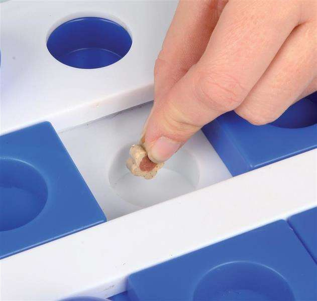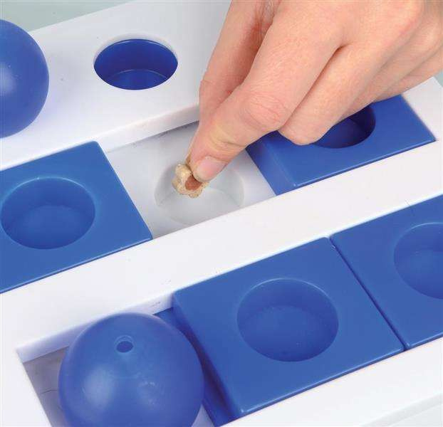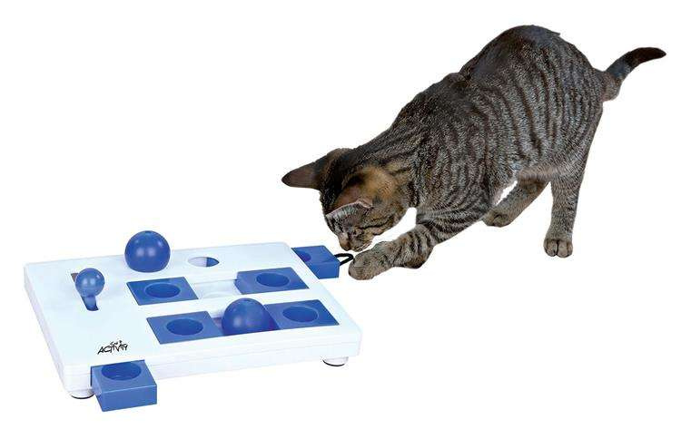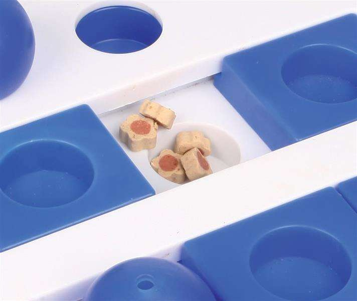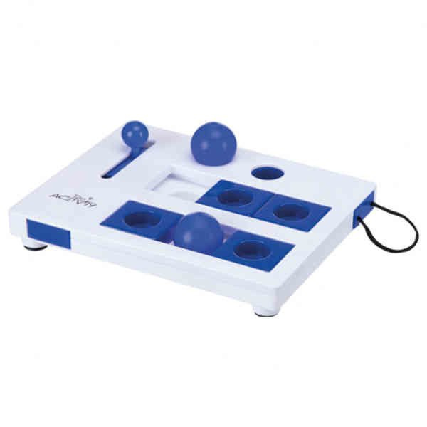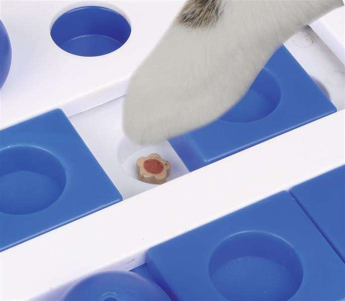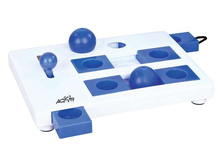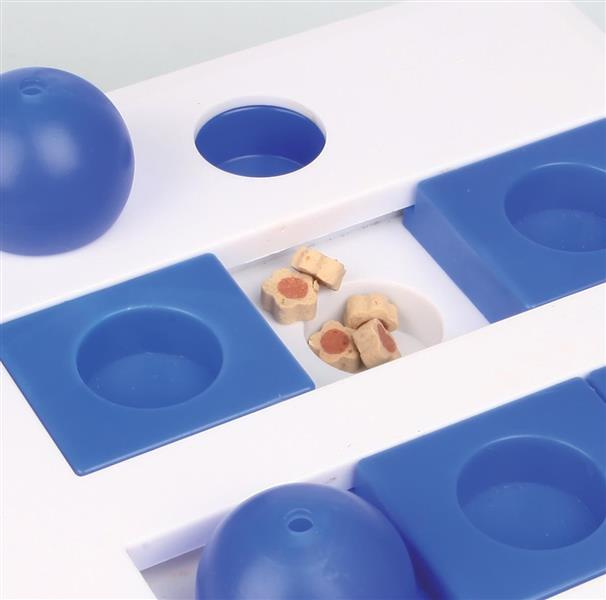 Trixie Brain Mover to zabawka w postaci gry strategicznej dla kota. Zawiera schowki specjalnie dostosowane do kocich łapek: pokrywki w kształcie piłek, szuflady oraz zasuwki, aby ukryć ulubione przysmaki przed Twoim pupilem. Zabawka pozwala podszkolić umiejętności i spryt małego drapieżnika, a zarazem jest dla niego wspaniałym zajęciem, któremu może poświęcić uwagę np. podczas rozłąki z właścicielem. Nadaje się również dla starszych i schorowanych kotów. Posiada specjalne gumowe nóżki, które zapobiegają ślizganiu się po podłodze. Produkt dodatkowo zawiera książeczkę z poradami dla optymalnego treningu Twojego pupila.