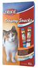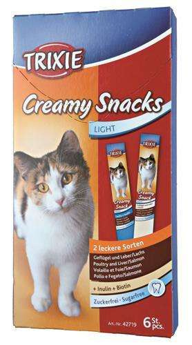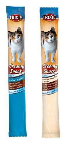 Trixie Creamy Snack to przysmak dla kota w postaci kremowej pasty o dwóch smakach: łososia z inuliną oraz drobiu z wątróbką i biotyną. Bogaty inulinę wspomagającą prawidłowe trawienie i wzmacniającą system odpornościowy oraz biotynę dla zdrowego wyglądu skóry i okrywy włosowej. Pakowany w pojedyncze saszetki w celu zapewnienia stałej świeżości. Bez cukru, sztucznych konserwantów i barwników. Opakowanie zawiera 6 saszetek (2 smaki po 3 sztuki każdy).