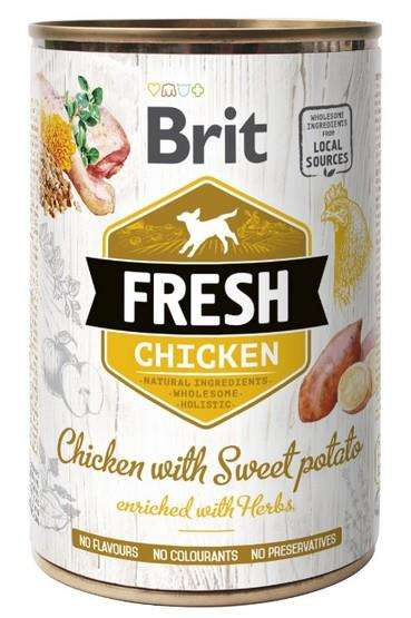 Brit Fresh Chicken with Potato to świeże mięso z kurczaka z ziemniakami, gryką, jabłkiem i tymiankiem Pełnowartościowa, Karma mokra z mięsem, podrobami, warzywami, owocami oraz ziołami od lokalnych dostawców. Wyprodukowana tylko ze świeżego, schłodzonego mięsa, które naturalnie zachowuje swój smak mięsny aby zapewnić unikalny smak. Bez zbóż, konserwantów, polepszaczy smaku i sztucznych barwników.