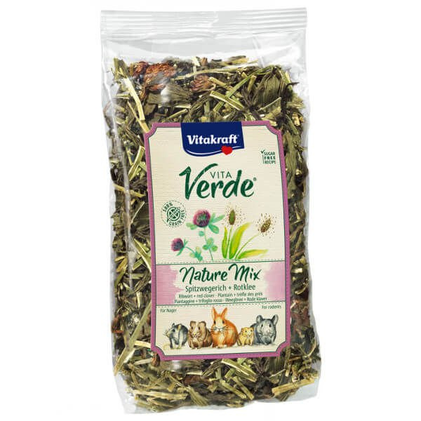 Vitakraft Vita Verde Nature Mix koniczyna i babka lancetowata to wyjątkowo smaczna przekąska. Wnosi więcej naturalności do menu królików i gryzoni! Całkowicie naturalny, pochodzący wyłącznie z roślin suplement diety. Karma pozytywnie wpływa na drogi oddechowe. Babka lancetowata oraz koniczyna czerwona poprawiają zdrowie i ogólne samopoczucie gryzonia. Suszone zioła są produktem czysto naturalnym, naturalnie nie zawierają dodatku cukru ani barwnika. Zdrowa przekąska pomiędzy podstawowymi posiłkami dla królika i gryzoni!