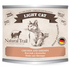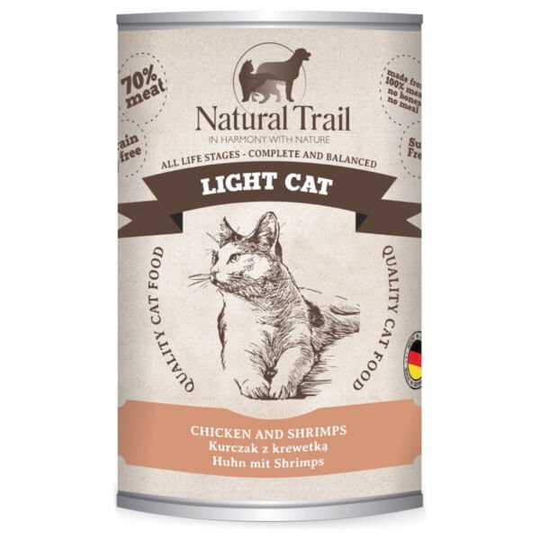 Natural Trail Light Cat kurczak z krewetką to kompletna i zbilansowana karma superpremium dla kotów. Mamy tu wszystko czego potrzebują zwierzęta mięsożerne, dlatego z pełną świadomością można powiedzieć, że jest to pożywienie zgodne z naturalnym. Tak opracowana karma korzystnie wpływa na kompleksowy rozwój, system immunologiczny, stan mięśni oraz żywotność. Odpowiednia dieta i miłość jaką obdarzasz kota stanowi klucz do długiego, pełnego energii i szczęśliwego życia. Naturalny zestaw składników zawierający w sobie zarówno wysoką jakość składników, technologię na najwyższym światowym poziomie, pozwala porównać Natural Trail do tego wszystkiego co mądre, inteligentne i w najwyższej jakości. W przypadku karm dla kotów, bardzo ważne jest aby białko w karmie było białkiem pochodzenia zwierzęcego, które jest zgodne z naturalnym zapotrzebowaniem. Propozycje karm Natural Trail dla kotów to wynik wieloletnich doświadczeń, znajomości problematyki związanej z żywieniem kotów i wiedzy na temat kocich potrzeb i wymagań dietetycznych.