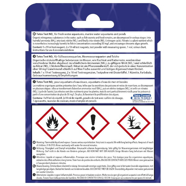 Zestaw testów do pomiaru zawartości azotanów od Tetra, to szybki i prosty w obsłudze test do wielokrotnego stosowania. Mierzy poziom pH, twardość węglanową (KH) i ogólną (GH) oraz zawartość azotynów (NO2), azotanów (NO3) i chloru (Cl2). Test no3- 3 rea nadaje się do użytku w akwariach słodko i słonowodnych.
