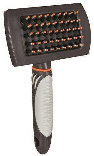 Szczotka prostokątna Trixie z jednostronnie osadzonymi plastikowymi zębami zakończonymi kuleczkami, które chronią przed zadrapaniem pupila podczas czesania. Jest miękka i służy do delikatnej pielęgnacji zewnętrznej i wewnętrznej warstwy sierści. Trixie Care Brush plastic posiada rączkę antypoślizgowa, dzięki temu łatwiej trzymać ją w dłoni podczas pielęgnacji psa.