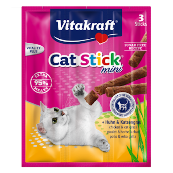 Vitacraft Cat Stick Mini to pyszne i miękkie paluszki dla kota, idealne jako przekąska lub nagroda. Przygotowane ze świeżego mięsa, stanowią nie lada pokusę dla każdego kota. Kabanosy posiadają nacięcia, dzięki którym łatwo jest je podzielić na mniejsze porcje.