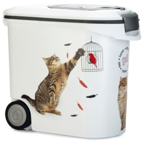 Pojemnik na karmę lub żwirek dla kotów Curver. Wykonany jest z elastycznego, wytrzymałego na zarysowania i pęknięcia plastiku. Pomysłowy system podwójnego otwierania pozwala na szybkie nasypanie świeżej porcji karmy do miski czy żwirku do kuwety. Wygodny uchwyt i kółka pozwalają na łatwe przenoszenie pojemnika, a zastosowana gumowa uszczelka zapewnia świeżość przechowywanej karmie.