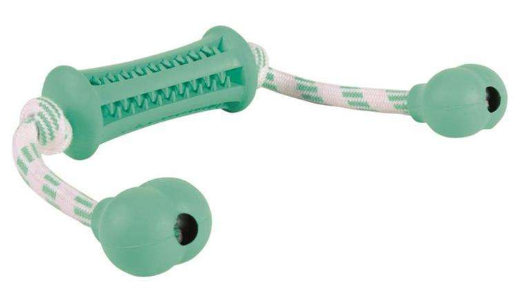 Z obu stron gryzaka są bawełniane sznury zakończone kulkami - można bawić się z psem w przeciąganie.