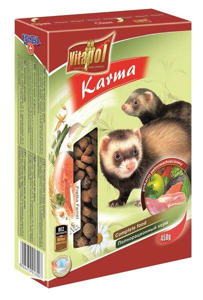 Rekomendowana codzienna porcja karmy dla fretki 50 - 80 g w zależności od wagi i wieku. Młodym fretkom podawać suchą karmę lub namoczoną w ciepłej wodzie.
