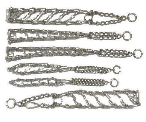 Oba końce właściwej obroży połączone są dodatkowo łańcuszkiem zaciskowym potęgującym efekt szkoleniowy.