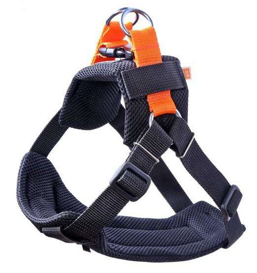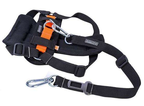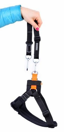 Pas składa się z dwóch elementów: wygodnych miękkich szelek i smyczy łączącej psa z samochodem.