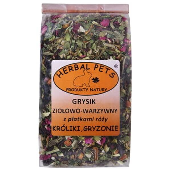 Grysik ziołowo-warzywny z płatkami róży dla królików i gryzoni, jest źródłem łatwo przyswajalnych naturalnych witamin oraz substancji mineralnych zawartych w ziołach i warzywach. W składzie jest marchew, topinambur i burak. Marchew to bogate źródło prowitaminy A, witamin B, C, E, K i PP i mikroelementów. Topinambur poprawia przemianę materii i wspomaga prawidłową mikroflorę jelitową. Wzmacnia układ odpornościowy, obniża poziom glukozy we krwi. Burak zawiera duże ilości witaminy C, ale przede wszystkim działa krwiotwórczo. Wspomaga układ krwionośny oraz oczyszczanie organizmu. Mieszanka jest wzbogacona płatkami róż działającymi witaminizująco na organizm małego ssaka. Produkty Herbal Pets charakteryzują się wysokojakościowymi składnikami naturalnego pochodzenia.