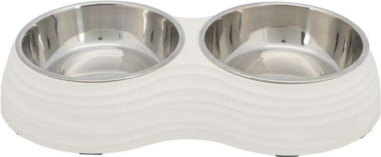 Trixie zestaw misek ze stali nierdzewnej dla Twojego psa, idealny do podawania jednocześnie karmy i wody. Jest łatwy do utrzymania w czystości, miski są wyjmowane i można je myć w zmywarce. Stojak jest wykonany z wysokiej jakości melaminy odpornej na zniszczenia i zarysowania. Dzięki antypoślizgowym nakładkom Twój pies będzie mógł spokojnie jeść, miska nie będzie mu się przesuwać. Megazoologiczny.pl poleca zakup tego wyjątkowego zestawu obiadowego, który będzie dodatkowo stylowo wyglądał w Twojej kuchni.