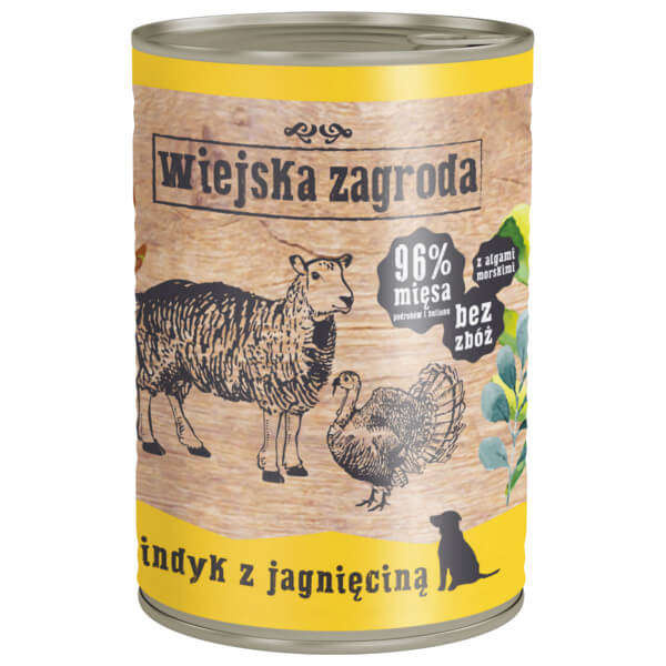 Wiejska Zagroda to polska marka, która powstała z potrzeby podania naszym psom tego, czego potrzebują, czyli mięsa! Karma mokra Wiejska Zagroda to pełnowartościowy, zdrowy posiłek dla psa, niezależnie od tego, czy jest mały, duży, krótkowłosy czy kudłaty. Pies to mięsożerca, a my zadbaliśmy, by w naszym menu znalazło się tylko to, co najlepsze. Podstawą posiłku jest zatem duet starannie wybranych mięs w aromatycznym bulionie własnym. Mięso jagnięce jest jednym z najzdrowszych mięs. Jest bogate w odżywcze białko i witaminy z grupy B, które są niezbędne do prawidłowego funkcjonowania całego organizmu. W duecie z delikatnym indykiem to propozycja idealna na co dzień dla czworonogów, a także dla pupili z nieco wrażliwszym żołądkiem. Smakowitym dodatkiem do mięsnej uczty jest świeży olej z łososia, bogactwo kwasów tłuszczowych Omega 3 EPA i DHA, cennych dla sierści i skóry Twojego psa. Kolejnym cennym składnikiem są dobroczynne algi morskie, które stanowią bogactwo witamin, minerałów oraz wartościowych substancji odżywczych. Proste składniki, bez zbędnych dodatków jak zboża, soja czy polepszacze smaku to nasz przepis na zdrowie i witalność pupila.