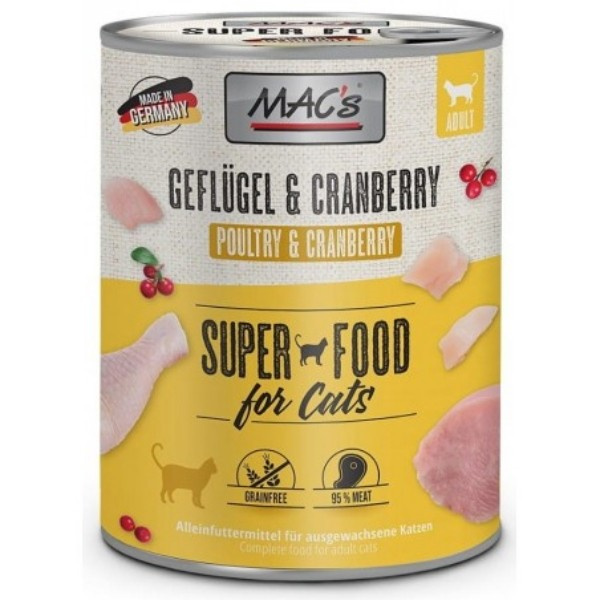 MAC's to szczególnie smaczna i wyjątkowo aromatyczna, pełnoporcjowa mokra karma o wysokiej zawartości mięsa (70%) dla dorosłych kotów. Zapewnia wszystkie substancje odżywcze oraz witaminy i minerały, niezbędne do prawidłowego funkcjonowania całego organizmu Twojego pupila. Dodatek żurawiny ma pozytywny wpływ na układ moczowy oraz wspiera odporność. Dodatkowo karma została wzbogacona w taurynę – życiodajny aminokwas niezbędny w codziennej diecie. Bez zbóż, konserwantów i sztucznych barwników.