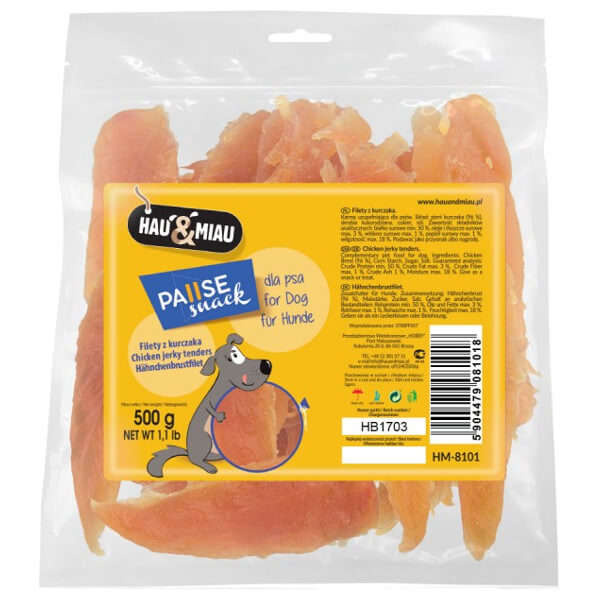 Przysmak Hau&Miau dla psów w formie naturalnie suszonych filetów z kurczaka. Mięso drobiowe zawiera pełnowartościowe białko, ważne dla utrzymania silnych mięśni, mocnych kości i zdrowych zębów. Przekąska będzie doskonałą nagrodą podczas zabaw lub zdrową przekąską między posiłkami. Przeznaczona dla psów wszystkich ras. Wspaniały przysmak, który zajmie każdego psiaka na dłuższą chwilę. Tłuszcze zawarte w przysmakach są cennym źródłem energii niezbędnej do prawidłowego funkcjonowania organizmu. Kwasy tłuszczowe pomogą utrzymać zdrową skórę i lśniącą sierść Twojego pupila.