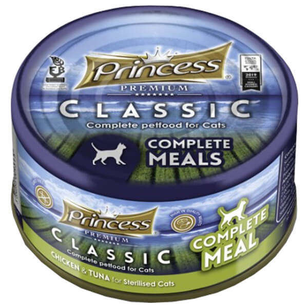 Princess Classic Complete Meal sterylized kurczak tuńczyk z optymalną zawartością tauryny jest gwarancją doskonałego pożywienia dla kotów dorosłych i starszych. 44% świeżego, naturalnego mięsa, bogatego w składniki odżywcze aby zapewnić jak najlepsze działanie systemu immunologicznego, ułatwić trawienie oraz zapewnić jak najlepszą ochronę przed codziennym stresem i infekcjami. Szeroki wybór niezwykle smakowitych receptur zaspokaja wszelkie wyjątkowe potrzeby kotów. Naturalne składniki, w skład, których wchodzą mieszanki warzyw, witamin, ziół, ekstraktów roślinnych i owocowych zapewniają bogatą suplementację i wiele korzyści dla organizmu. Mięso – dla jak największej wartości odżywczej, o jakości przeznaczonej dla ludzi, spełnia najwyższe możliwe standardy i jest akceptowane przez weterynaryjne normy prawne UE wynikające z certyfikatów IFS
