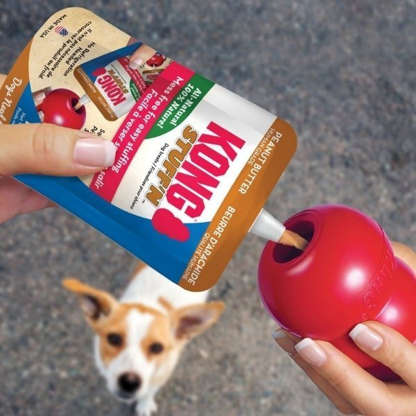 Kong Stuff'N to naturalnie pyszne masło orzechowe. Poznaj pasty Kong w nowej odsłonie! Przysmak ten zapakowany jest w wygodnej saszetce zaprojektowanej z dziubkiem, dzięki czemu możecie nadziewać zabawki Kong całkowicie bez bałaganu. Ten smakowity przysmak dla psa sprawdzi się idealnie do użycia podczas szkolenia w domu lub w podróży. Zwiększ wyzwania w zabawie swojego psa i wzbogać smakołyk, używając Kong Stuff'N na wierzchu wypchanego bałwanka z serii Puppy, Classic, Extreme lub Senior, umieszczając go w zamrażarce na 4 - 6 godzin, tworząc wzbogacającą i długotrwałą łamigłówkę żywieniową swojemu Mega psiakowi. Nie wymaga przechowywania w lodówce.