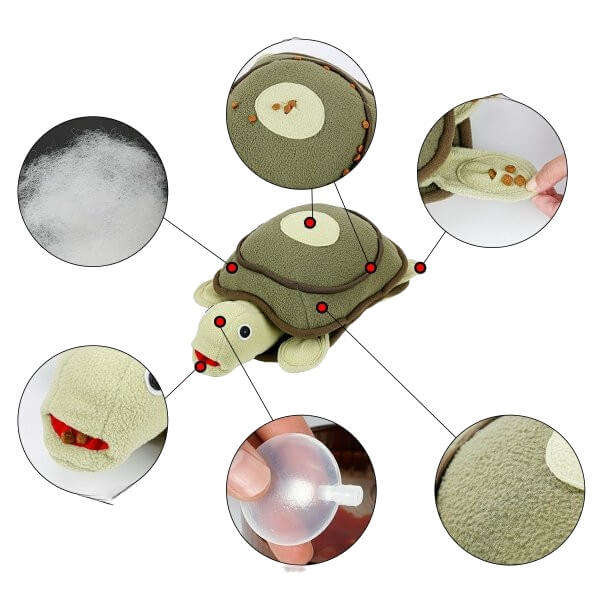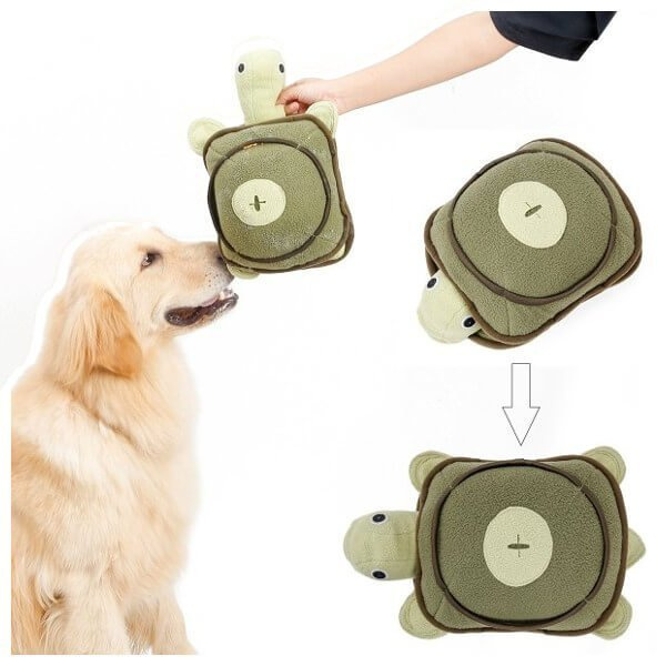 Zabawka węchowa na przysmaki w kształcie żółwia, to idealne akcesorium dla Twojego pupila, gdyż wiadomo, że psy mają wspaniały węch. Ważne aby trenować węch swojego pupila, a do tego jest idealna prezentowana maskotka. Dzięki niej pies uczy się koncentracji, wytrwałości oraz wyciszenia. Trening umysłowy (węchowy) jest lepszy niż intensywny spacer. Ta zabawka jest idealna dla psów każdej rasy oraz w każdym wieku. Wystarczy umieścić w niej ulubione przysmaki, a pies resztę zrobi sam i nie będzie się nudził. Żółw ma wiele miejsc do ukrycia przysmaków: na tułowiu, nogach, głowie i ogonie. Dodatkowo, nogi, ogon i głowę możesz schować do skorupy żółwia jak to robi prawdziwy żółw! Zadaniem Twojego psa będzie wyciągnięcie tych części, aby dorwać przysmaki. Zabawka zawiera w sobie również piszczałkę dla zwiększenia wrażeń u psa.