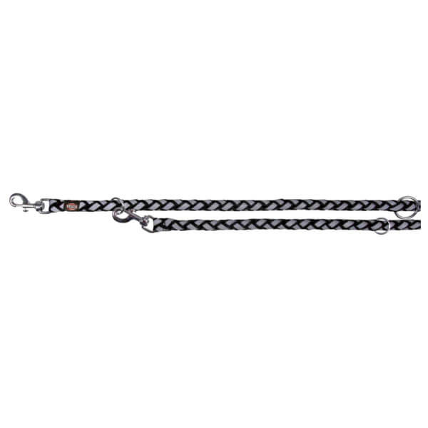 Smycz regulowana Cavo Reflect od marki Trixie jest wyjątkowo wytrzymała, wykonana z plecionej taśmy nylonowej owiniętej w okół odpornego na zgniatanie i rozciąganie rdzenia. Dzięki okrągłemu przekrojowi dobrze trzyma się w dłoni. Brak szyć i łączeń pozwolił w znacznym stopniu wyeliminować słabe punkty smyczy, neoprenowe obicie to pewność że pies nie dozna obtarć na skórze. Idealna dla mocno ciągnących psów, posiada 3 stopnie regulacji. Dzięki jej wyjątkowemu wzornictwu i ciekawym kolorom na pewno wyróżnisz się z tłumu na codziennych spacerach. Wzór smyczy odwzorowuje liny używane przez alpinistów, jest bardzo wytrzymała. Posiada metalową klamerkę którą, łatwo podczepisz do każdego rodzaju obroży. Dodatkowym jej atutem jest podniesienie poziomu bezpieczeństwa Twojego psa podczas spaceru dzięki odblaskowym elementom.