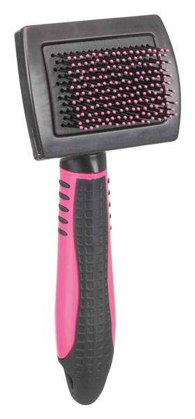 Szczotka prostokątna Trixie z jednostronnie osadzonymi plastikowymi zębami zakończonymi kuleczkami, które chronią przed zadrapaniem kota podczas czesania. Jest miękka i służy do delikatnej pielęgnacji włosa okrywowego i podszerstka. Szczotka posiada rączkę antypoślizgowa, dzięki temu łatwiej trzymać ją w dłoni podczas pielęgnacji. Delikatne druciane włosie z plastikowymi końcówkami sprawi, że czesanie stanie się dla kota chwilą przyjemnego relaksu.