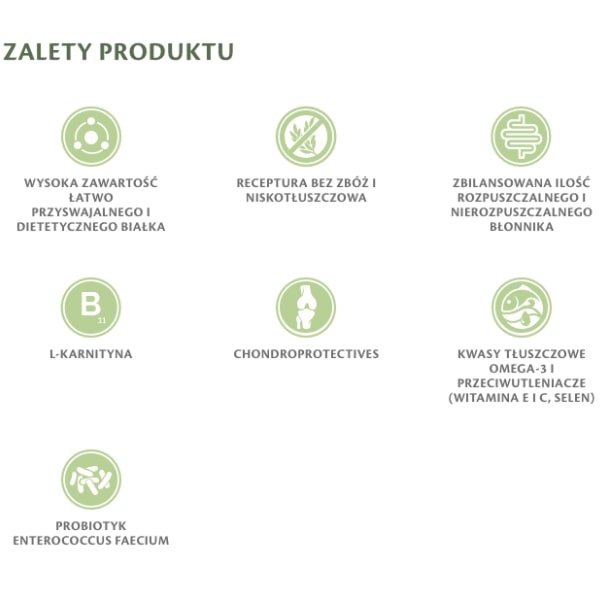 Analiza: białko surowe 37,0%, zawartość tłuszczu 12,0%, włókno surowe 6,5%, popiół surowy 8,0%, wilgotność 10%, kwasy tłuszczowe omega-3 0,5%, kwasy tłuszczowe omega-6 1,35%, wapń 1,6%, fosfor 1,2%, sód 0,35%, magnez 0,08%, skrobia 16%, cukry łącznie 1,5%.