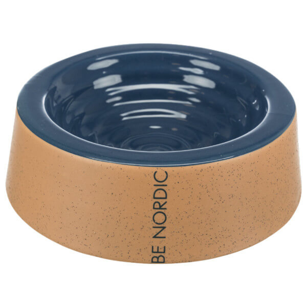 Miska koloru ciemnoniebiesko-beżowa od marki Trixie, z linii produktów "Be Nordic". Można w niej podawać wodę jak i również pokarm suchy czy mokry. W miskach ceramicznych można bez obaw dodawać suplementy diety dla pupila. Jest ciężka i stabilna. Nie ślizga się po podłodze podczas jedzenia. Wysoki brzeg zapobiega rozsypywaniu karmy i wylewaniu wody przez pupila. Marka Trixie wspiera projekty ochrony mórz, przekazując część zysków ze sprzedaży tej serii, robiąc to, przyczynia się do zrównoważonej ochrony przyrody i ochrony wielu gatunków.