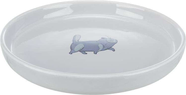 Jasno szara miska Trixie wykonana z ceramiki zadowoli każdego kociego konesera. W środku znajdziemy rysunek szarego kota, który nadaje ciekawego wyglądu misce. Średnica miski to 13 cm, daje to gwarancję, że kot podczas jedzenia nie zahaczy wibrysami o brzegi miski. Bowiem wibrysy to inaczej włosy czuciowe, pomagają kotu orientować się w ciemności i poznawaniu otoczenia. Prezentowana miska jest szeroka i ma obniżone ranty by nie drażnić właśnie kocich wibrysów, co mogłoby zniechęcić kota do pobierania pokarmu. Koty z natury to bardzo czyste zwierzęta, dlatego ceramika, łatwa w czyszczeniu nada się świetnie na miskę dla kota. Dodatkowo miskę tą można myć w zmywarce.