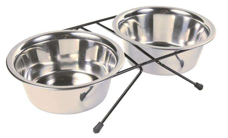 Trixie zestaw misek metalowych na stojaku dla Twojego psa, idealny do podawania jednocześnie karmy i wody. Jest łatwy do utrzymania w czystości oraz odporny na zadrapania. Wykonany z wysokiej jakości stali nierdzewnej, odpornej na zniszczenia. Dzięki stojakowi z antypoślizgowymi nakładkami Twój pies będzie mógł spokojnie jeść, miska nie będzie mu się przesuwać. Czarny stojak wykonano z metalu malowanego proszkowo.