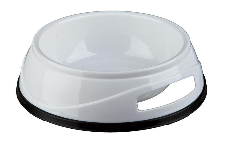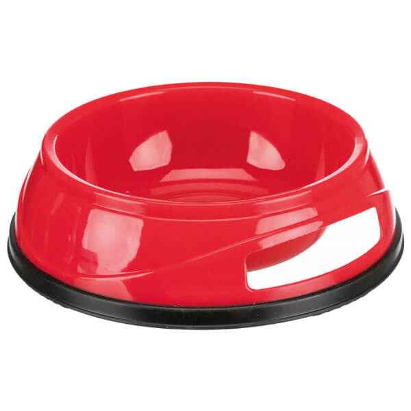 Solidnie wykonana, z tworzywa sztucznego, miska dla psa. Świetnie sprawdza się zarówno przy karmie suchej jak i mokrej. Gumowy spód zapobiega ślizganiu się miski po podłodze.