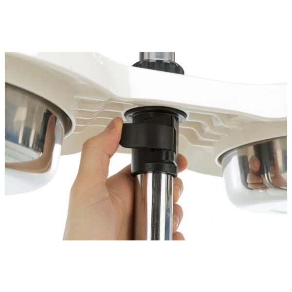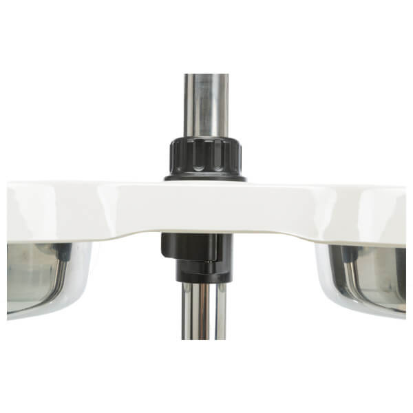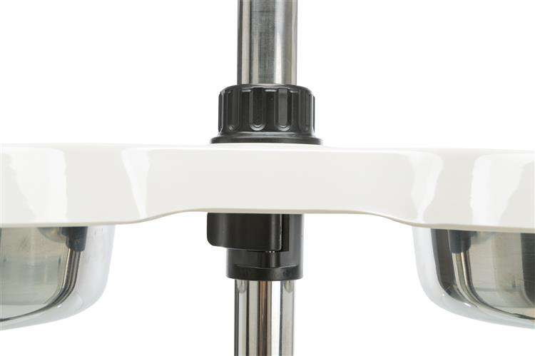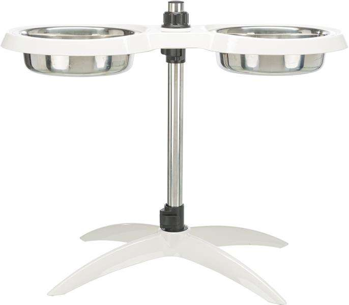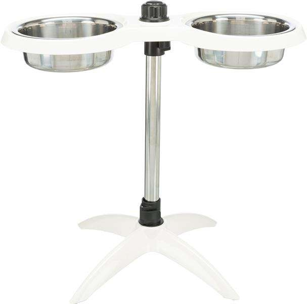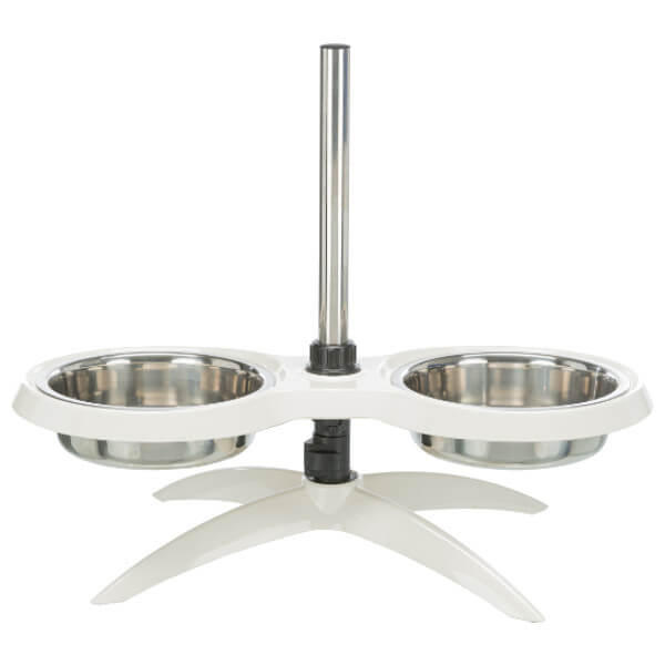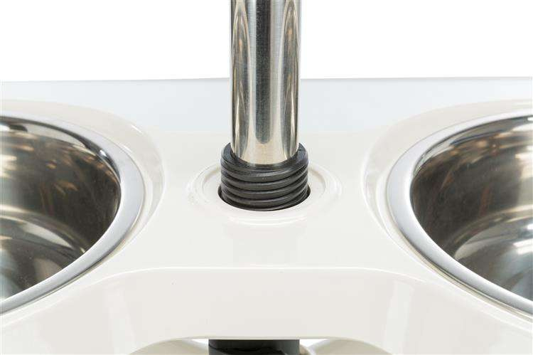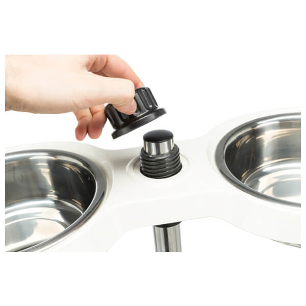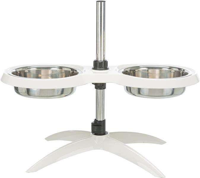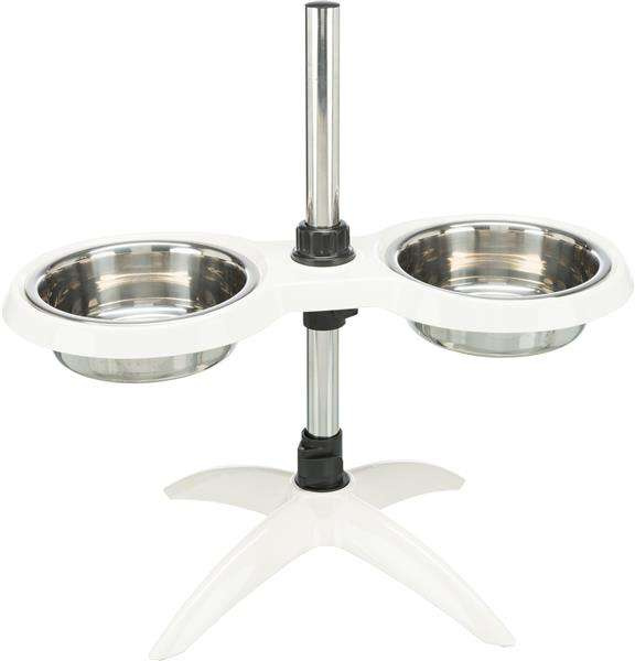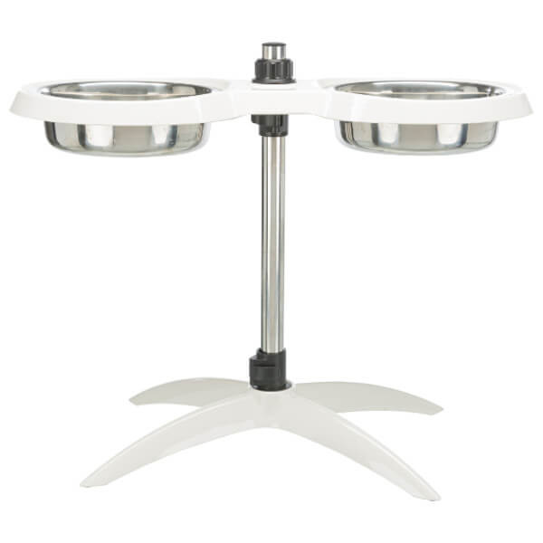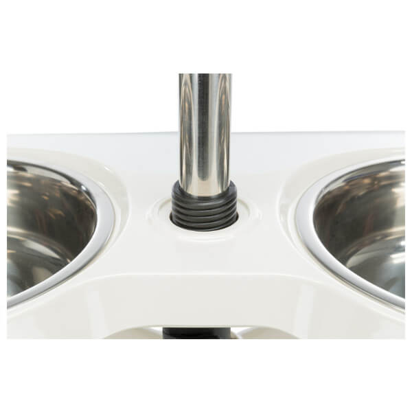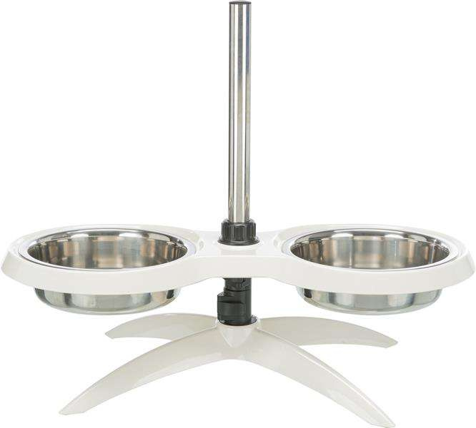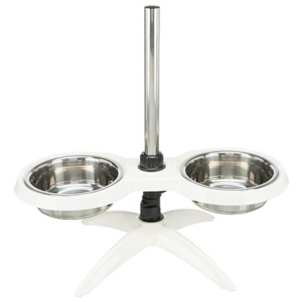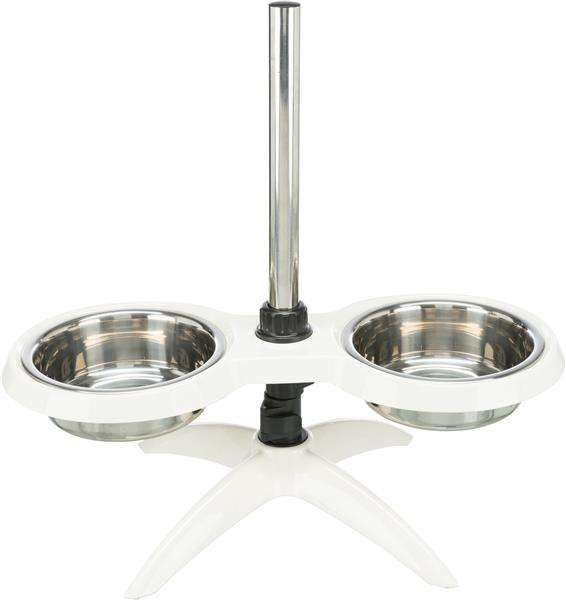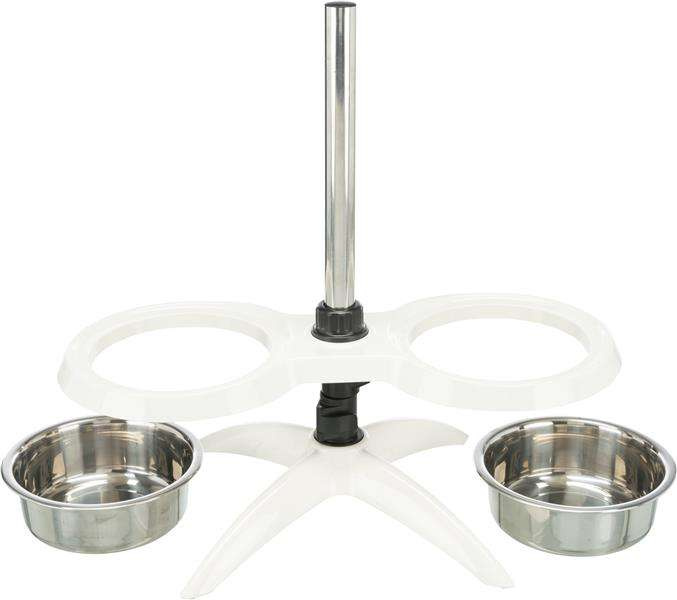 Trixie stojak z dwiema miskami z melaminy, z regulowaną wysokością. Można go ustawić na wybraną wysokość, dostosowując ją optymalnie do potrzeb Twojego psa. Zapobiega to bolesnemu wyginaniu ciała przy schylaniu się do miski, a przez to uszkodzeniu stawów przednich łap czy dysków. Ponadto optymalne dopasowanie wysokości miski zapobiega ślinieniu, rozrzucaniu i łapczywemu pochłanianiu pokarmu. Ten stojak na miski to, dzięki możliwości regulacji jego wysokości, idealny produkt, który może być wykorzystany od lat szczenięcych do późnej starości psa. Melaminowe miski są umieszczone w pierścieniu gumowym i przymocowane za pomocą urządzenia dociskowego. Plastikowy ochraniacz na pierścieniach zapobiega obracaniu się misek podczas jedzenia. Stopka antypoślizgowa gwarantuje stabilność stojaka - nawet podczas najbardziej gwałtownych poruszeń utrzyma miski i pozostanie w pionie. Miski wyczyścisz łatwo i szybko, gdyż nadają się do mycia w zmywarce.