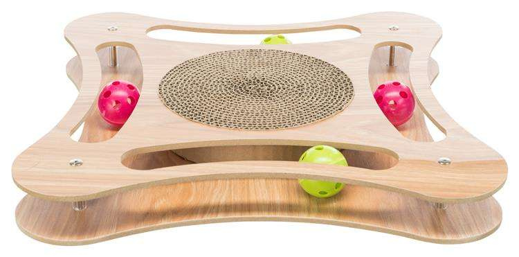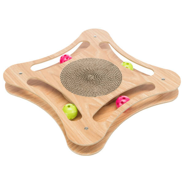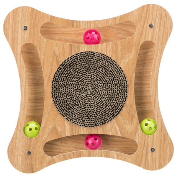 Trixie tekturowy drapak w drewnianej ramce z czterema piłeczkami, 2 w 1 dla Twojego kota. Drapak firmy Trixie cieszy się dużą wytrzymałością, a dzięki dołączonej kocimiętce przykuwa uwagę kota i pochłania ją na długi czas. Zabawka wykonana została z nietoksycznych materiałów. Spełnia tradycyjną funkcję, jak również dzięki czterem piłeczkom umieszczonym w drewnianej ramce, doskonale zachęci kota do aktywności. Jest to szczególnie ważne w przypadku kotów, które przesypiają większość dnia i nie zaznają go wiele, co może wpłynąć negatywnie na ich wagę. Piłeczki zostały wyposażone w dzwoneczki. Ta niekończąca gonitwa za kolorowymi piłeczkami szybko stanie się ulubioną zabawą kota, a tekturowy środek pozwoli na ścieranie ostrych pazurków. Drapaki konstruowane są w taki sposób aby poza swoją podstawową funkcją zachęcić koty do częstszej zabawy i aktywności fizycznej. Często również ich wykonanie pozwala wpasować je w rozmaite wnętrza, sprawiając, że wyglądają one estetycznie.