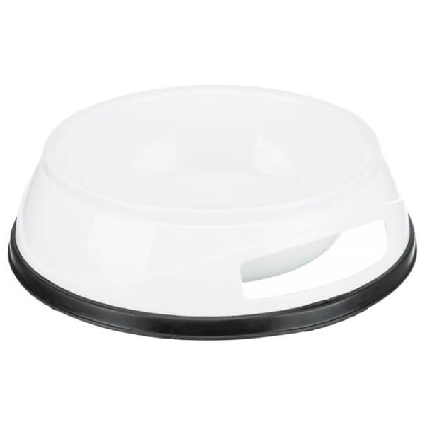 Solidnie wykonana, z tworzywa sztucznego, miska dla psa. Świetnie sprawdza się zarówno przy karmie suchej jak i mokrej. Gumowy spód zapobiega ślizganiu się miski po podłodze.