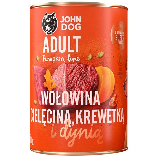 John Dog Pumpkin Line z dodatkiem superfoods to pełnoporcjowa karma mokra dla dorosłych psów wszystkich ras. Karma jest w 100% naturalna karma mokra, bez dodatku zbóż, sztucznych barwników i konserwantów. Bogata w antyoksydanty, minerały i jod.