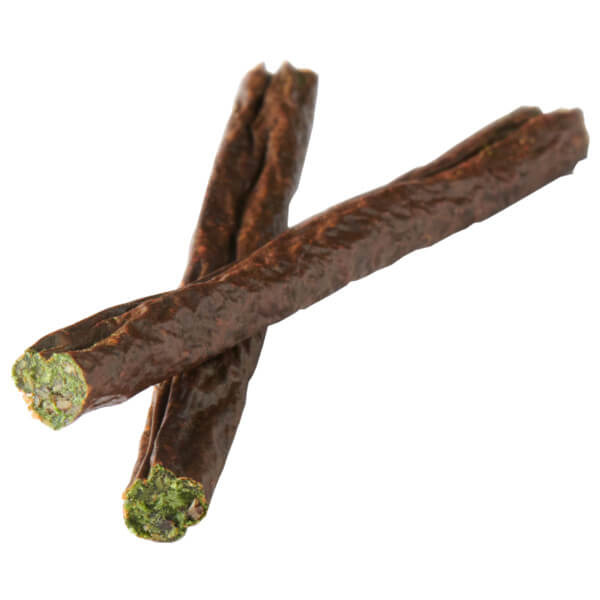 Przekąska od polskiej marki John Dog stworzona z myślą o zdrowych i czystych zębach psa. Naturalny przysmak wyprodukowany z mięsa wołowego i drobiowego, z dodatkiem siemienia lnianego i chlorofilu. Chlorofil wykazuje właściwości łagodzące stany zapalne w obrębie jamy ustnej i stawów oraz obniża poziom pH całego organizmu. Dodatkowo ma również właściwości detoksykacyjne. Przechowywać w suchym i chłodnym miejscu z dala od działania promieni słonecznych. Po otwarciu szczelnie zamknąć opakowanie do następnego użycia.