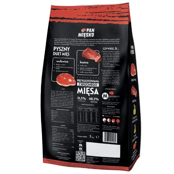 Poznaj hipoalergiczne suche karmy dla psów Pan Mięsko. Wyróżniają je starannie wyselekcjonowane mięsa z dodatkiem soczystych polskich jabłek, zdrowych warzyw i cennych składników odżywczych, które pozytywnie wpłyną na zdrowie oraz kondycję Twojego psa. Nasze receptury zostały przygotowane przez specjalistów, po to, aby dostarczyć Twojemu czworonożnemu towarzyszowi dokładnie to, czego potrzebuje. Twój pies zasługuje na wszystko, co najlepsze. Mięsne połączenie wołowiny i koziny, to strzał w dziesiątkę. Wołowina jest mięsem, które bogate jest w żelazo, witaminę A i jest bardzo dobrze przyswajalne przez organizm naszych czworonogów. Kozina natomiast uznawana jest za idealne źródło fosforu i wapnia. Dodatkowo jest to chude mięso, bogate w kwasy Omega-3. Wszystkie białka w karmie podawane są procesowi hydrolizy, w którym białka są dzielone na mniejsze części, dzięki czemu układ immunologiczny psa nie identyfikuje ich jako alergen. Dzieje się tak, ponieważ małe cząsteczki rozbitego składnika nie wywołują reakcji alergicznej. Karma sprawdzi się doskonale w diecie psiaków cierpiących na alergie pokarmowe. Chrupki w rozmiarze M (Medium).