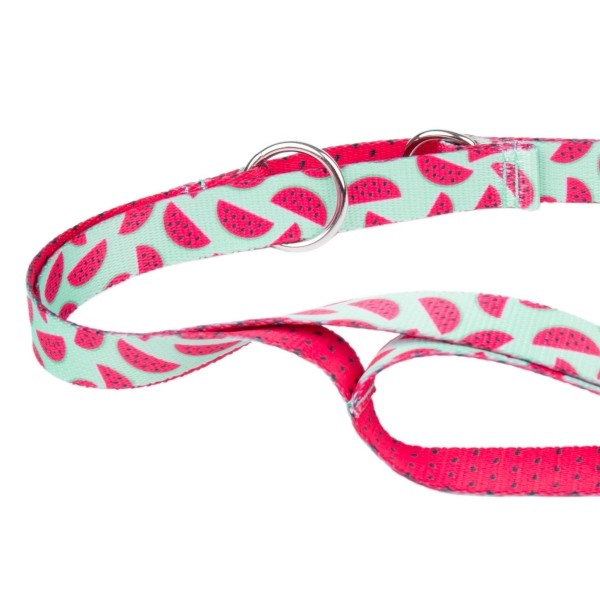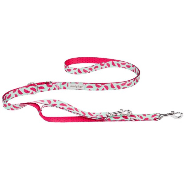 Smycz z serii BeHappy 7in1 od amiplay we wzorze Watermelon to doskonały wybór na codzienne spacery. Świetnie sprawdza się zarówno u psów dorosłych jak i u szczeniąt w trakcie nauki chodzenia na smyczy. Posiada regulację długości, dzięki której możemy dostosować ją do każdej sytuacji. Kiedy pies ma być blisko np. przy przejściu przez ulicę bądź mijaniu przechodniów można spiąć smycz na długość minimalną, czyli 115 cm. Jeśli można pozwolić na większą swobodę możemy zapiąć smycz na długość 140 cm, natomiast po całkowitym rozpięciu można otrzymać smycz o długości 2 m, co pozwala psu na swobodę i eksploatację terenu bez szarpania opiekuna. Jest to idealne rozwiązanie dla szczeniąt, które są bardzo ciekawe świata. Smycz wykonana jest z wytrzymałej taśmy, odpornej na warunki atmosferyczne o niezwykle radosnej kolorystyce. Jest bardzo łatwa w czyszczeniu, wystarczy przetrzeć ją wilgotną szmatką lub wyprać, gdy zajdzie taka potrzeba i znów jest gotowa do użycia. Smycz jest idealnej długości dla zapewniania psu bezpieczeństwa, a opiekunowi wygodę. Ponadto wszyty dodatkowy uchwyt w jej dolnej części, pozwala na szybką reakcję i kontrolowane przytrzymanie psa w każdej sytuacji. Smycz posiada dwa karabińczyki, jeden do swobodnego przypięcia do szelek bądź obroży, natomiast drugi do regulacji długości. Dodatkowym atutem jest możliwość wyprowadzania dwóch psów na jednej smyczy bądź przepięcie jej przez ramię tym samym uwalniając ręce.